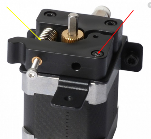 Ciao a tutti, vorrei capire una cosa. Mi sembrava d'aver risolto tutti i miei problemi di sottoestrusione (sono riuscito a stampare anche 7/8 ore senza problemi) serrando una vite "ballerina" sul mio estrusore. Ora non riesco a fotografare il mio ma questo è simile. La vite che era ballerina era quella indicata con la freccia ROSSA. Serrandola saldamente il problema è di molto migliorato soprattutto serrando anche la molla (freccia gialla). Ora a parte che c'è qualcosa che mi sfugge e cioè se la molla è corta la pressione sul filo non dovrebbe essere minore? Mentre se la molla è allunga, la puleggia dovrebbe forzare maggiormente il filo sulla ruota godronata, non è così? Ad ogni modo nel mio caso la molla (freccia gialla) è molto compressa quasi faccio fatica a premere la leva per caricare il filamento. Le stampe vengono bene (8 ore senza problemi) ma ogni tanto sento ancora qualche click. Pareri? -