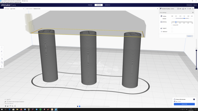 in attesa che mi arrivi la stampante (consegna prevista lunedì), stavo facendo un po' di esperimenti, che riguardano sia Fusion 360 (tra i diversi programmi che ho trovato, è quello che mi sembra più adatto alle mie esigenze) sia con Cura. Per prima cosa ho realizzato un banalissimo frontone di tempio greco, formato da tre colonne, un'architrave e un timpano legate insieme in Fusion in un pezzo unico, poi ho esportato tutto in Cura e ho provato a vedere come effettuava lo slicing.