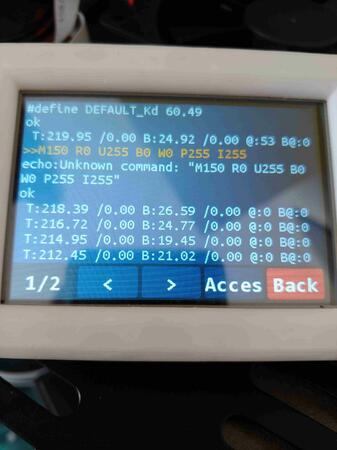 Allora lanciando il comando M303 E0 S220 C8 è partito correttamente, non so poi cosa dovrebbe fare nello specifico essendo la prima volta che lo faccio, cmq vedevo che cambiqva la temperatura, inizialmente arrivava fino a 240° poi mano mano che andava avanti e cambiava i valori di kp e gli altri andava sempre più intorno ai 220, alla fine ha fatto un bip ed è spuntata questa schermata, dopodichè ha spento la cartuccia e pian piano scendeva la temperatura. Però da lì si vede solo kd ma gli altri due valori non ci sono, e poi che cavolo è quel comando in arancione? 🤔 -