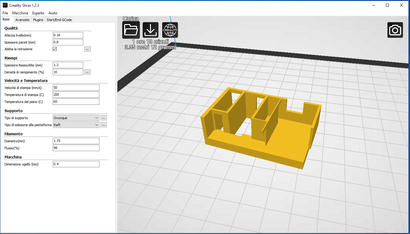 @Killrobhai ragione: altezza livello 0.12 mm - spessore pareti 0.8 mm - spessore base 1.2 mm velocità di stampa 50 mm/s - temperatura 200 C e 60 C PLA Geetech 1.75 Grazie! -