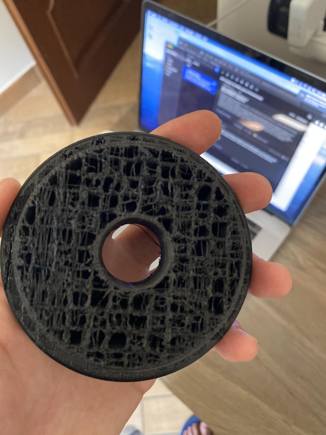 Gli estep li ho già regolati, dovrei provare quello del cubo cavo. Ad ora stampa piuttosto bene, non capisco soltanto se mi fa così perché la temperatura era troppo alta e non riusciva a fare bridge per la copertura oppure non pesca Abbastanza filamento. -