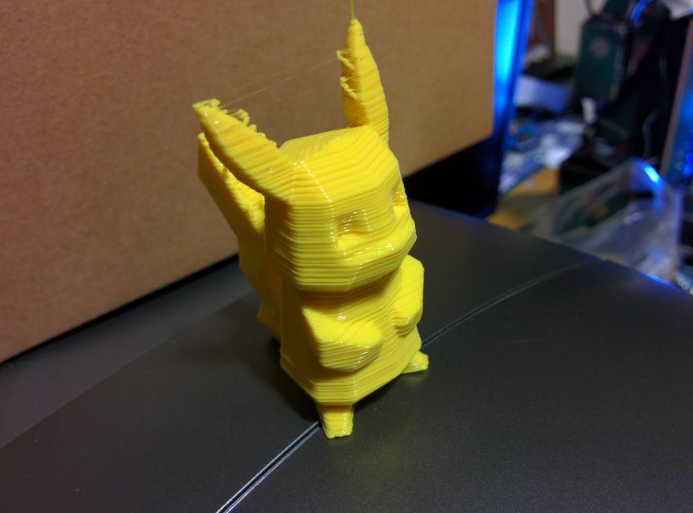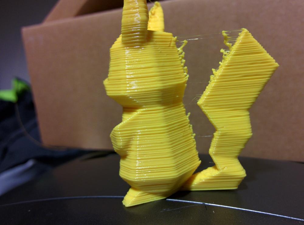 A me sembra che nei punti più piccolini, come la parte stretta della coda, il materiale non cada al suo posto ( nella foto si vede molto bene, è in aria! ). Non capisco se sia colpa della velocità, o della temperatura d'estrusione. NB: sulla velocità è impostata su 60mm/s, dalla manopola della stampante abbasso tutto del 50%.