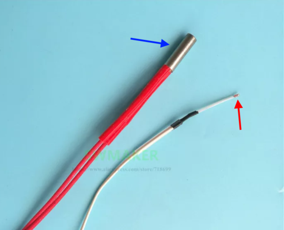9. Hai ragione, delle foto in rete non ci si dovrebbe mai fidare. Per essere sicuri dovrei vederne una del tuo hotend. Riguardo allimmagine che hai postato è di un kit comune per le stampanti di un po di tempo fa. Andrebbe bene per esempio sul V6 clone della mia Mark1 In blu la cartuccia riscaldante, in rosso il termistore a goccia. Il termistore mostrato in queste immagini prese dal sito Anycubic è del tipo a cilindo (di solito diametro 3mm lunghezza 15mm), formato che sta diventando abbastanza comune ultimamente. Il fatto però che sul sito Anycubic non lo vendano come ricambio mi fa sospettare che quello non sia un componente standard. Quindi ancora una volta devi verificare quale sia il tuo, o al limite cambiare tutto con qualcosa di noto.