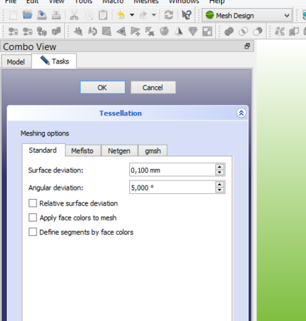 16. Se hai usato l'Esporta del menù file quello non serve per la stampa 3D (veramente non penso serva a nulla). Se devi preparare il solido per la stampa devi aprire l'ambiente Mesh Design Poi selezioni l'oggetto che vuoi stampare e crei la mesh ti si apre il menù dello strumento e hai diverse opzioni di algoritmo e di qualità. Io preferisco l'algoritmo standard e in genere i parametri che vedi creano file abbastanza precisi ma non enormi A questo punto prendi l'oggetto creato e lo esporti Un consiglio: scaricati la versione 19, anche rispetto alla 18 è tanto più comoda