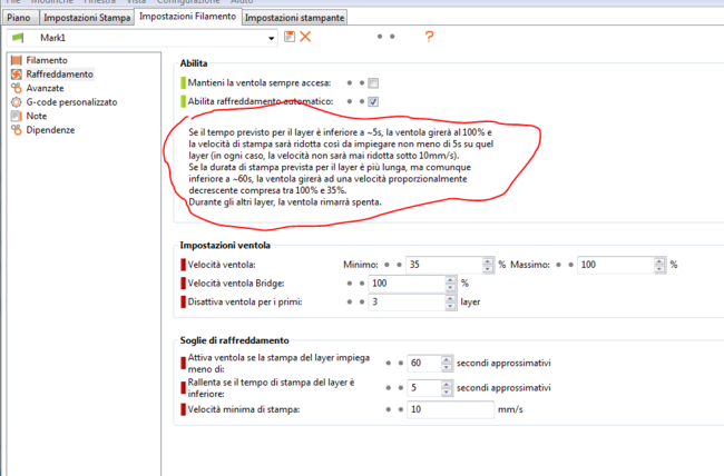 Non conosco ancora IdeaMaker ma penso che il raffreddamento venga gestito un po per tutti gli slicer in funzione di quanto velocemente stampi un layer, in modo che si solidifichi prima di metterci sopra altro materiale. In PrusaSlicer c'è una bella nota tecnica nella relativa pagina che ti spiega la cosa: Quindi, ponti a parte, tra 5 e 60s a layer la ventola modula tra 35 e 100%. Se cerchi probabilmente trovi la stessa cosa anche nel tuo slicer. I campi numerici quì sono visibili solo in modalità esperto.