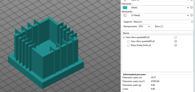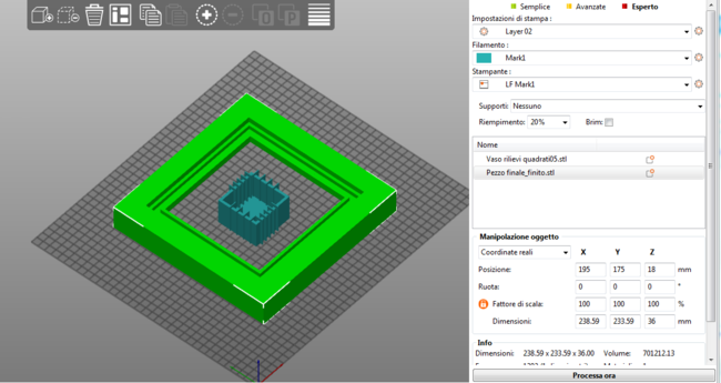 Non è che ti dico di passare a d un altro slicer, il suggerimento è di imparare a usare più di un programma pechè con questi problemi prima o poi ci si scontra tutti. Poi immagino che anche con Cura come con Slic3e ci sia la possibilità di combinare modelli dopo averli traslati e scalati. Vediamo cosa dicono gli altri. Per velocizzare se mi dici come li volevi combinati magari l'unione te la posso anche fare al volo, vedi allegato. Invece come esercizio perchè non ti ricrei il sorgente di quello che ti manca? Vaso rilievi quadrati05_combinato.stl -