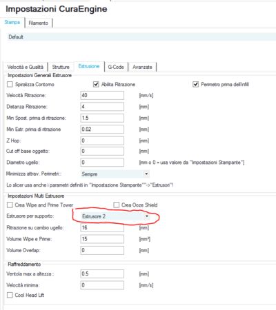 Una volta che hai configurato il profilo multiestrusore assegni l'estrusore alle strutture di supporto; per esempio questo è il menu in PrusaSlic3r: E cosi lo imposti in CuraEngine- 3 risposte