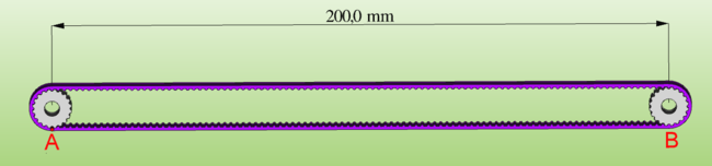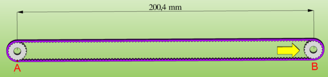 Ti faccio un disegno: due pulegge GT2 da 20 denti con una cinghia dentata da 220 denti. Se la tendo a valori "nominali" le pulegge vanno a 200mm e se faccio 5 giri di puleggia porto il punto rosso da A a B percorrendo 200mm Se tendo un po di più la cinghia, tipo un 0,2% le pulegge si troveranno a 200,4mm, per portare il punto da A a B ci vogliono sempre 5 giri ma il percorso lineare sarà più lungo di 0,4mm Funziona solo con le cinghe dentate, e solo per allungamenti molto piccoli tipo meno di 1%, ma visto che siatmo cercando i decimi o meno la cosa è comunque siglificativa. -