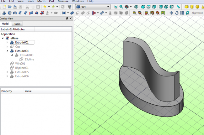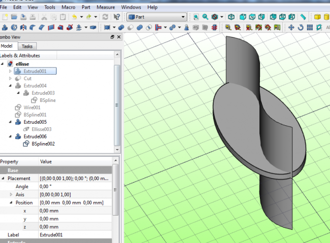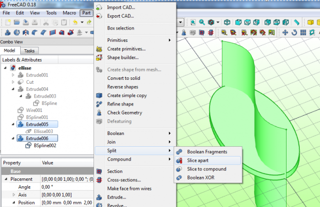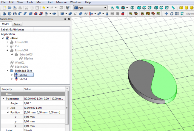 Riciao @Heda Non ho capito bene cosa vuoi fare con la linea inspessita e con le parti, quindi mi limito a descrivere i passaggi: - Per creare il solido della curva come detto in precedenza la estrudi prima in Z poi in Y. Nel tuo caso l'estrusione di Y la farei simmetrica. Funziona anche se la spline non ha tutti ipunti sullo stesso piano: Un mm di spessore mi sembra tanto viste le dimensioni del modello ma non sono affati miei. -Per dividere l'oggetto ho preso la curva, l'ho messa in piano e l'ho estrusa. Poi ho copiato l'oggetto che hai usato per fare la tasca. Ho stirato leggermente gli estremi della curva per creare un intersezione netta con l'ellisse (ho fatto 0,1mm in X, ma basterebbe anche meno. L'importatnte è che sporga dall'oggetto da tagliare), Ho selezionato i due solidi, prima l'ellisse poi la curva (l'ordine è importante) e ho usato la funzione "Slice apart" Ti risulta un oggetto composto da due parti separate. Ora puoi selezionare la singola parte, farne una copia rifinita e usarla per sommare o sottrarre volume al resto dell'oggetto. Spero di esserti stato utile. Allego il file ellisse.FCStd -