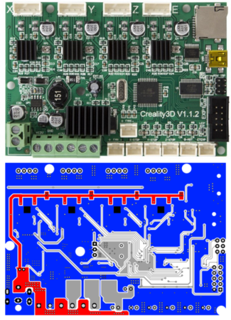 7. Modello base QUALE? Sono 4 tipi di Ender 3, con elettronica display, motori e che so altro differenti. Se non trovi il modello scritto da qualche parte posta un afoto. Difficile a dirsi. Se la scheda è quella il morsetti di ingresso dell'alimentazione sono collegati a quelli sempre acceso senza altri componenti in mezzo (sotto ho evidenziato le piste + rosso e - blu), trovi il PCB descritto qui Quindi potrebbe essere un danno al morsetto stesso, o a qualche pista, ma sono improbabili entrambe le ipotesi. Se misuri la tensione sulle viti del morsetto vedi che siano serrate. A questo punto però non capisco come fa a darti corto circuito se colleghi il ventilatore all'alimentatore, e non darti lo stesso problema quando è colegata sui suoi morsetti sempre acceso. Posta un foto dei cablaggi please.