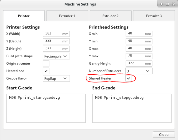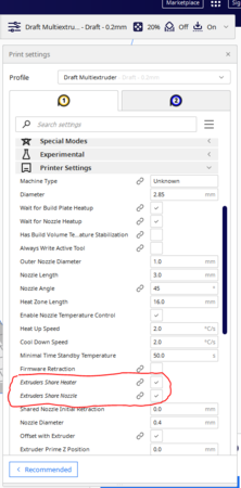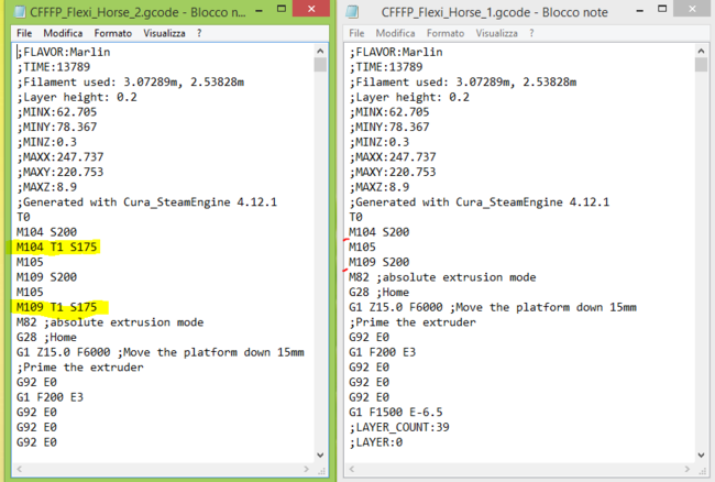 OK, ho fatto un po di compiti a casa (Cura 4.12.1 ma ho letto che è la stessa cosa su 4.13). La voce è sparita dai settaggi della macchina, ma si può ancora impostare nel profilo di stampa. Questi i passaggi: 1) istalla il plugin Printer settings 2) nel profilo di stampa espandi l'ultimo pannello (Printer settings) e spunta le due voci che indicano la presenza di un unico riscaldatore e di un unico ugello Fatto questo il codice viene generato senza i comandi per il secondo riscaldatore: a sinistra il codice pre modifica, a destra dopo. Nel codice a destra l'unico cambio di temperatura e il raffreddamento a fine file. -