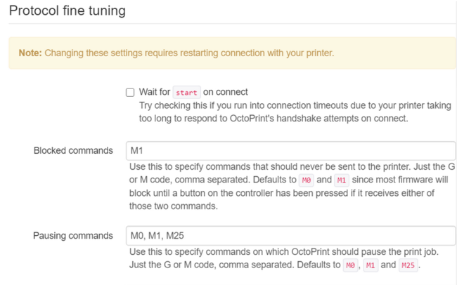 Con Octoprint aggiungi un ulteriore livello di complicazione, perchè fa da filtro per alcune funzioni. Non lo conosco bene ma da qualche parte dovresti trovare questa schermata: I comandi M0, M1 fanno eseguire lo script di pausa di Octoprint e di base non vengono inviati alla stampante.- 12 risposte