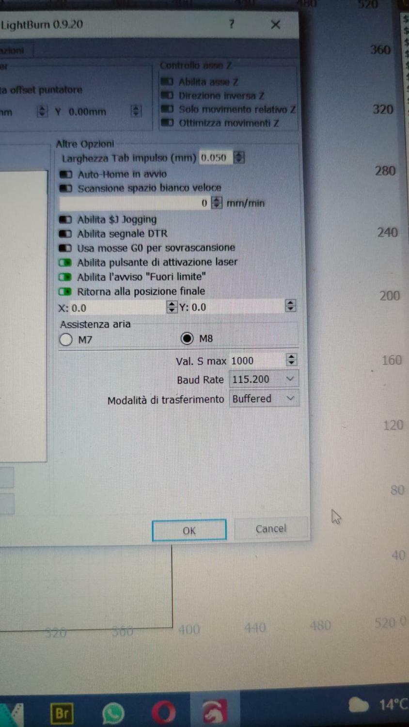 Come potete vedere dalla foto, ho provato a fare questa incisione con Lightburn, però si ostina a saltare delle parti. Ho provato con lo stesso file su laserGrbl e non ci sono problemi, lo fa perfetto.